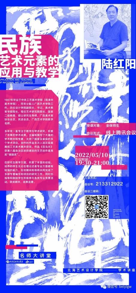 2022年5月10日,广西艺术设计学院教学名师陆红阳教授应邀为我校开展题为民族艺术元素的应用与教学”的线上讲座。讲座由设计艺术学院李林平院长主持。
