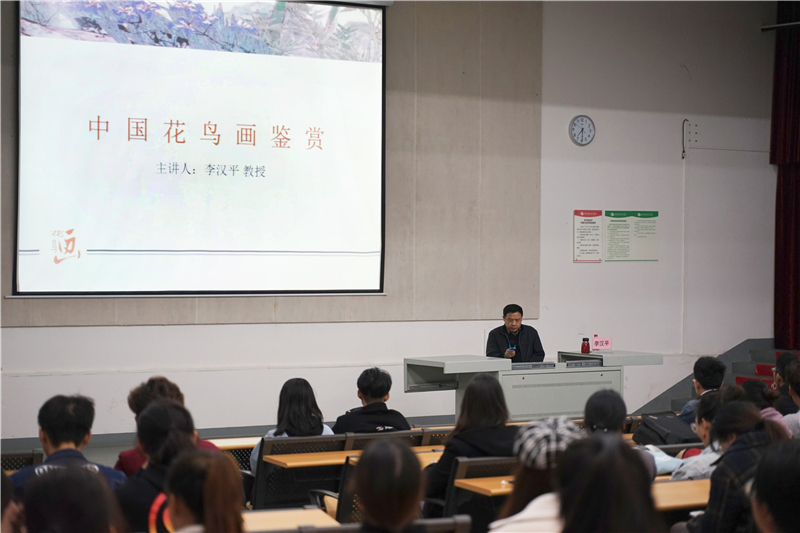 2018年12月28日晚7:30于我校西校区公德楼107,北京林业大学美术研究所所长、艺术学院教授、研究生导师、教育部学位中心全国硕士论文(社科类)评审专家李汉平教授带来一场题为《中国花鸟画鉴赏》的精彩讲座,广大师生现场聆听。本次讲座由我校副校长王斌主持。