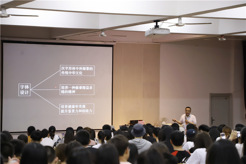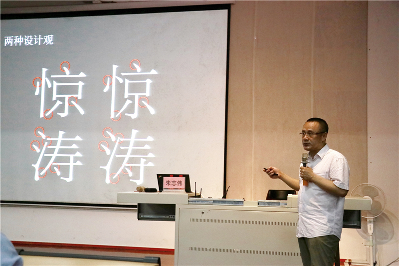 讲座过程中,朱教授还讲到字体设计要注重整体力量的统一。而我们学习字体的任务是达到直观完美的视觉效果和满足人类方便快捷的需求。另外,在字体设计中视觉变量也尤为重要,需要认真观察字体的细节元素和字体的变量。除此之外,字体设计也要注意字体的流畅性、重心稳定性、字面大小一致、字距行距、字形方正饱满,还有视觉张力和整体的排版,这对字体的视觉体验方面有着很大的提升作用。