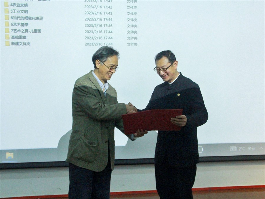 讲座开始前,卢新华校长为张树新教授颁发聘书,聘任张树新教授为我校设计艺术学院教授。
