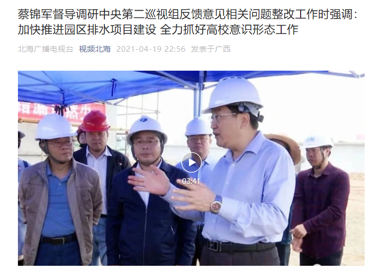 北海广播电视台:蔡锦军督导调研中央第二巡视组反馈意见相关问题整改工作时强调:加快推进园区排水项目建设 全力抓好高校意识形态工作