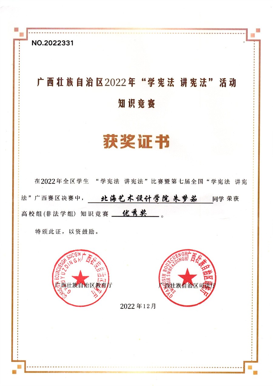 在此次赛事中,我校人文教育学院汉语言文学专业2104班朱梦茹同学荣获高校组(非法学组)知识竞赛优秀奖;俸莲云、莫圆圆老师在“学宪法,讲宪法”活动知识竞赛中荣获高校组(非法学组)知识竞赛指导老师优秀奖。