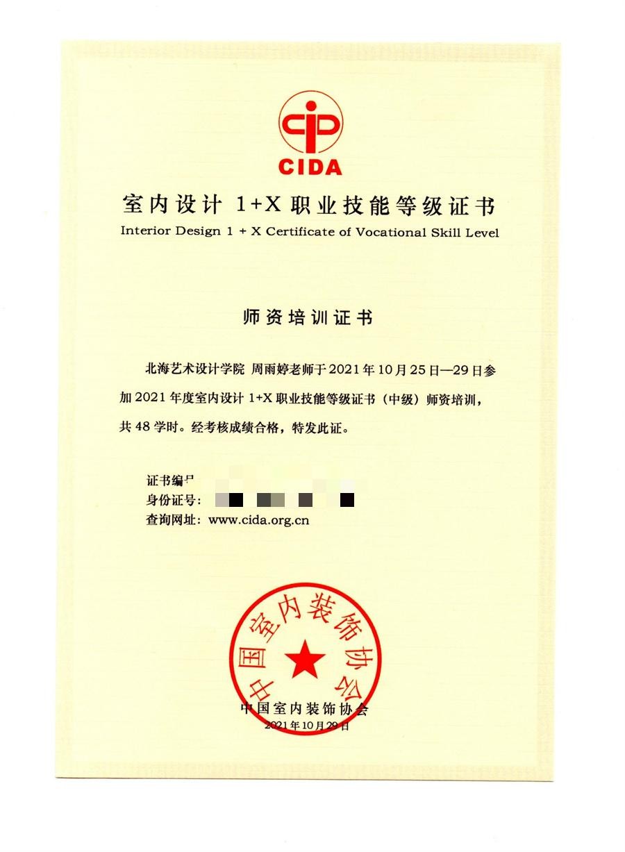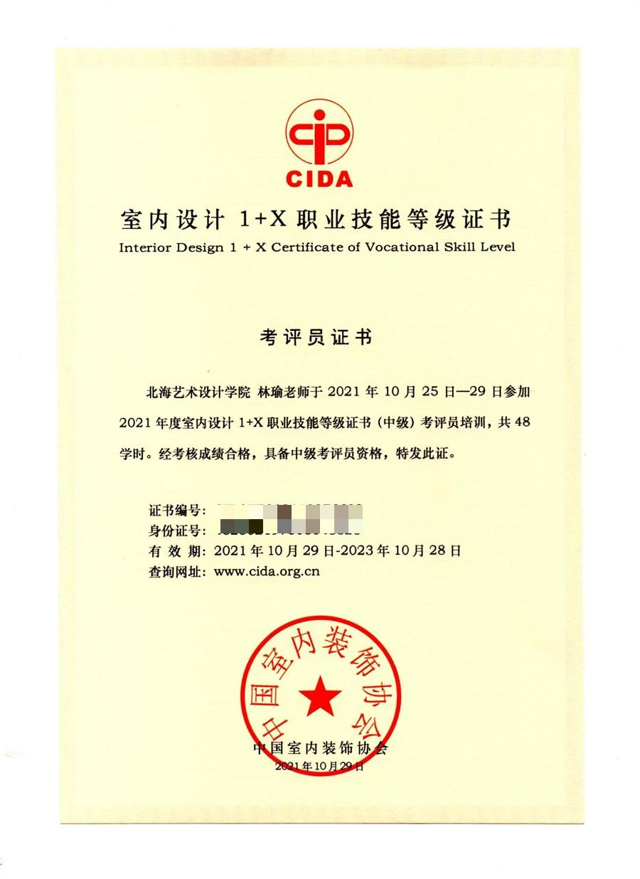 2021年10月我校建筑与环境艺术学院被遴选为全国1+X室内设计职业技能等级证书2021年度第一批考核站点。为落实相关工作安排,我校选派两位教师参加由中国室内装饰协会主办2021年度全国室内设计1+X职业技能等级证书师资及考评员培训(广西站),并通过师资及考评员考核。