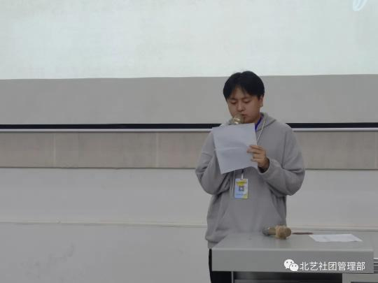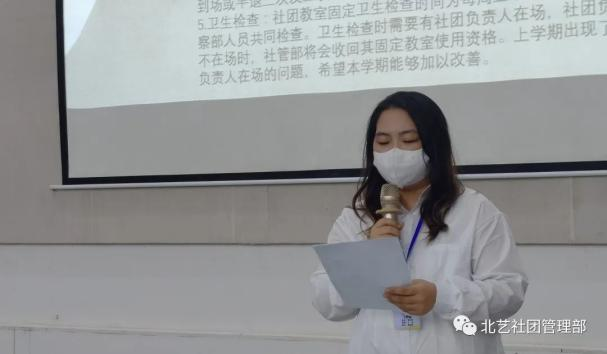 主席团代表魏天意讲了社团的日常工作,社团开课考勤和社团卫生检查的要求。