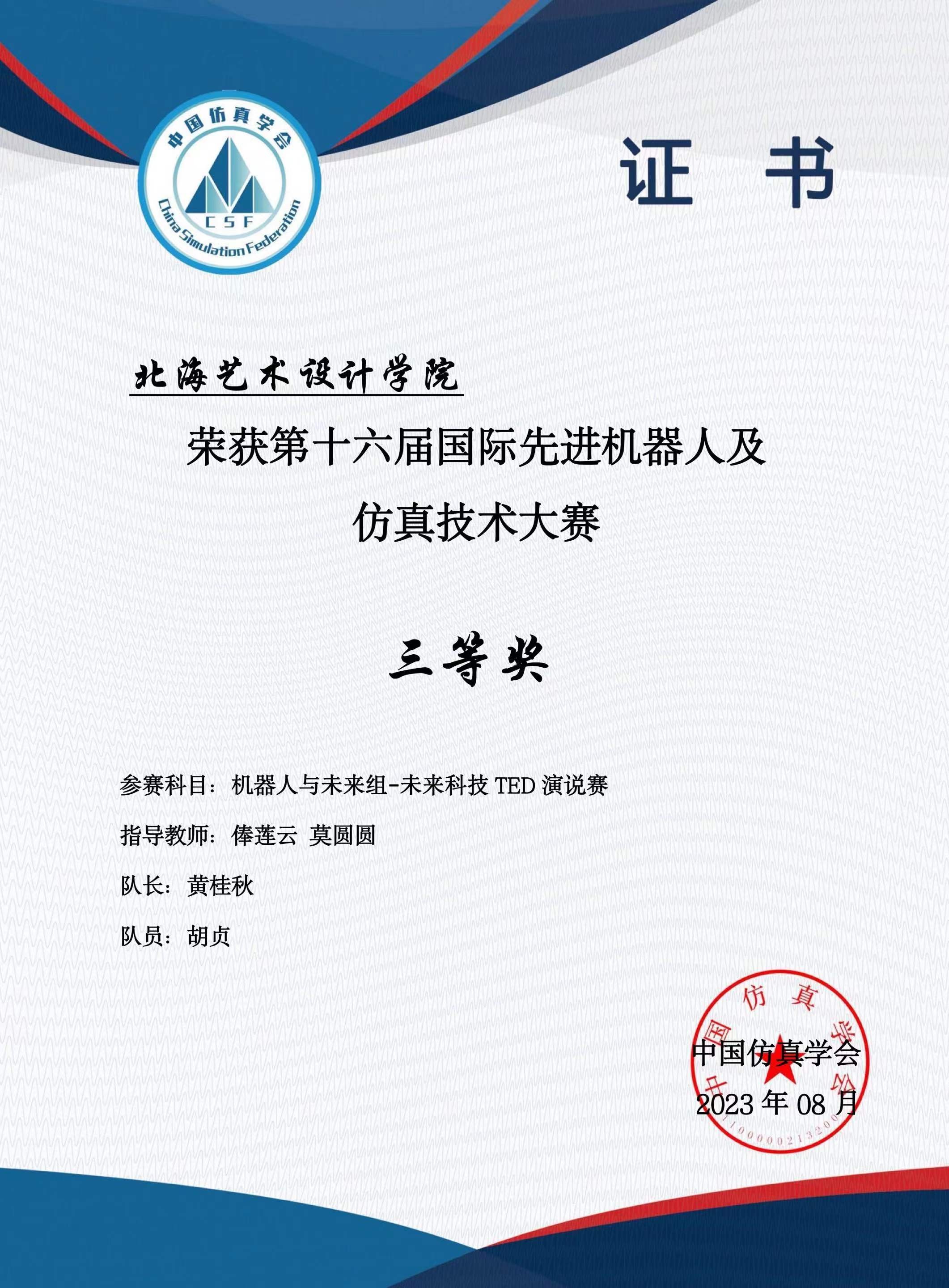 2023年3月在江苏太仓,由国际先进机器人及仿真技术大赛组委会举办国际先进机器人及仿真技术大赛正式开赛哲学、汉语言文学专业学生李闻晖程聪远黄桂秋胡贞朱梦茹王静涛胡正国李河婷组成的北海艺术设计学院代表队,在青年教师俸莲云何广西莫圆圆的指导下,取得一等奖,三等奖项的好成绩为我院师生首次在此类大赛中获奖。