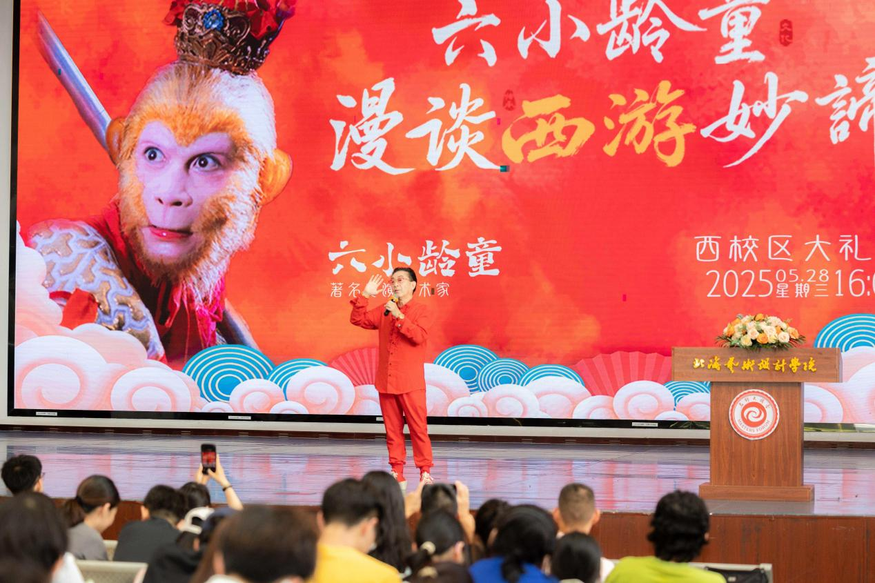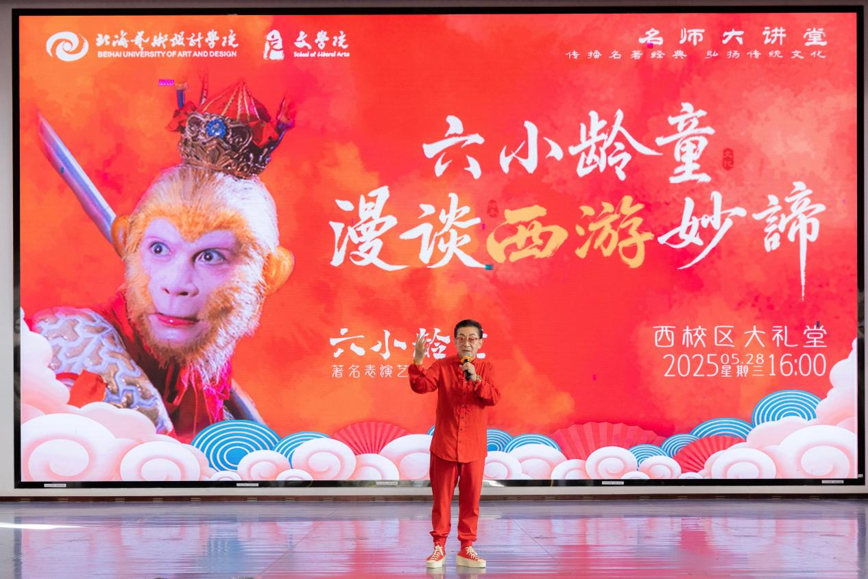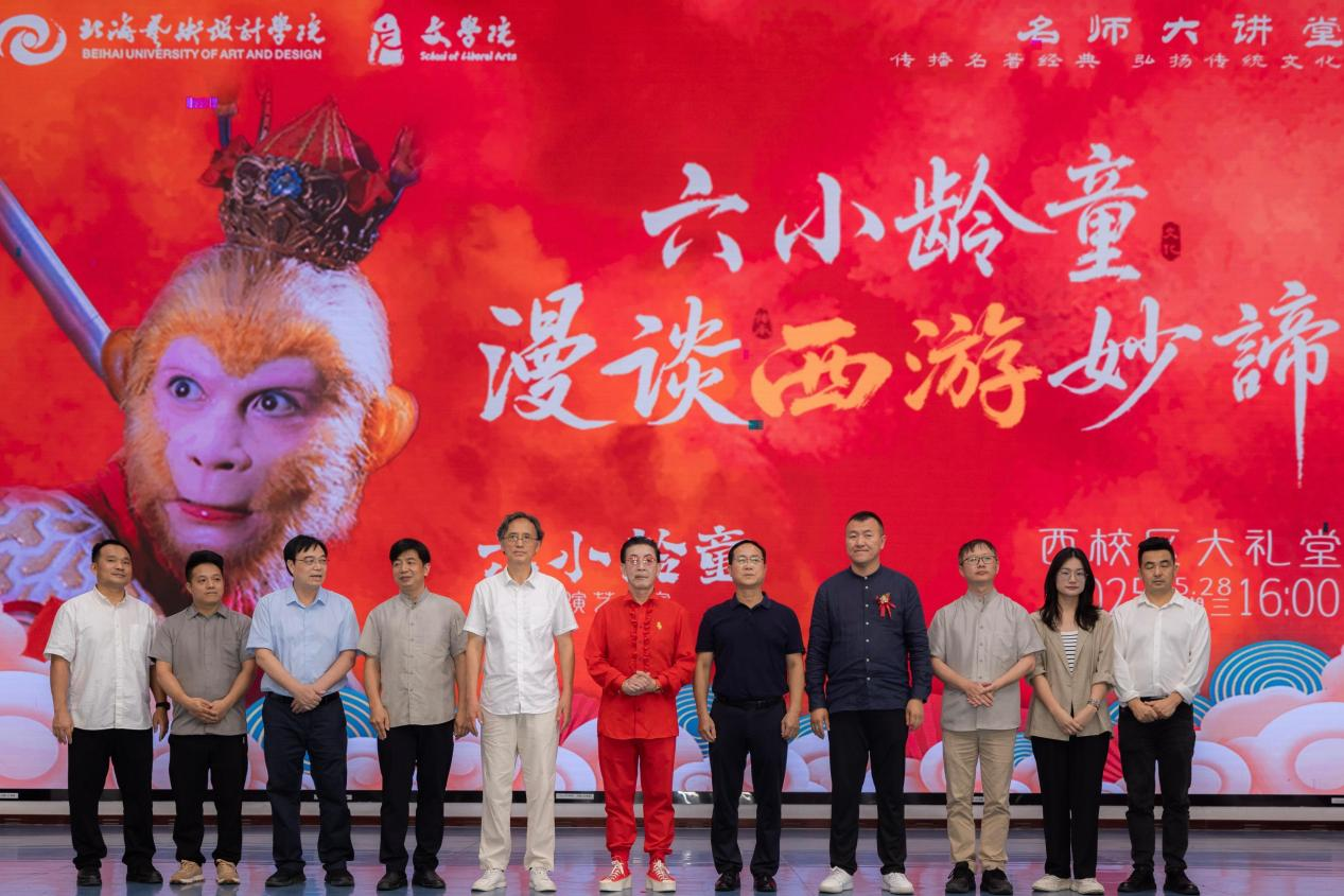 5月28日下午,北海艺术设计学院文学院以一场兼具学术深度与文化温度的活动,携手著名表演艺术家六小龄童老师共同架起经典与时代的交融纽带,让《西游记》的妙谛在当代青年中焕发新生。本次活动由文学院常务副院长梁镨文主持,通过丰富的活动形式与富有深度的讲座,在校园内掀起西游文化热潮,引发师生对经典传承的热烈讨论。