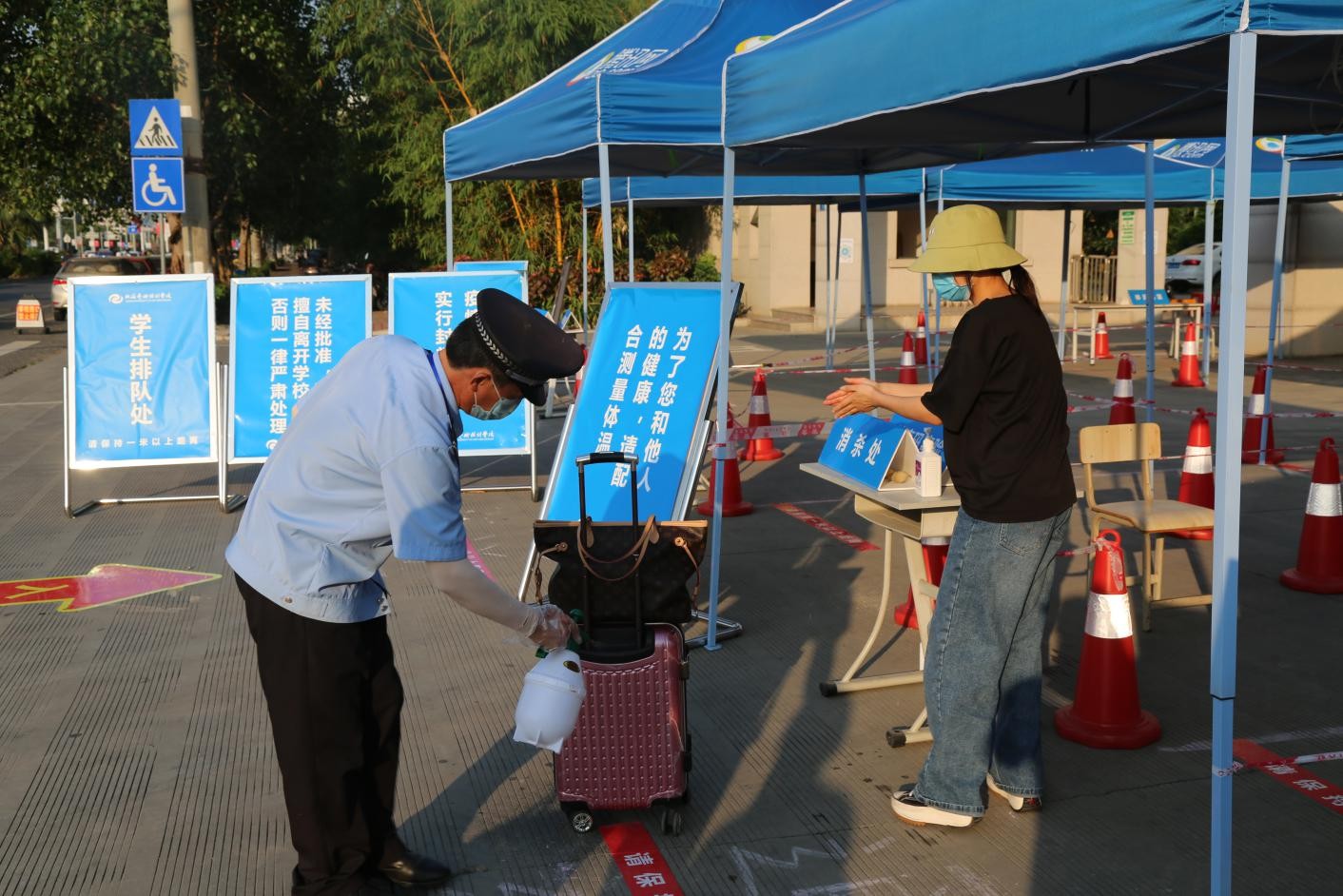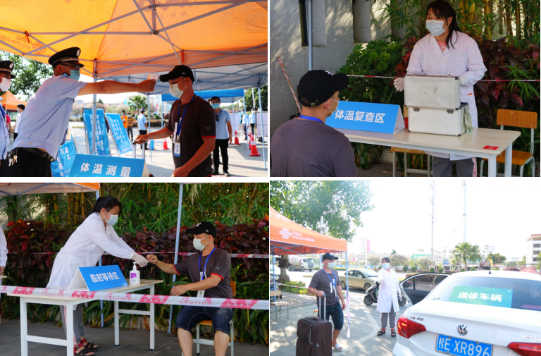 本次模拟演练按照预定流程开展返校进入校门、返回宿舍、教室上课、食堂取餐等四个环节演练。模拟学生返校后,消杀行李、扫码入校、测量体温、核验身份进入校园;返校经体温测量、扫码验证进入宿舍;上课时经体温测量进入教学楼;下课前往食堂排队测温取餐的四个场景。针对各个场景中出现发热学生实施应急处置进行了重点模拟演练,展示了体温复测、询问诊断、隔离处置、报告疫情、转移病人、现场消杀、心理安抚等系列处置过程。