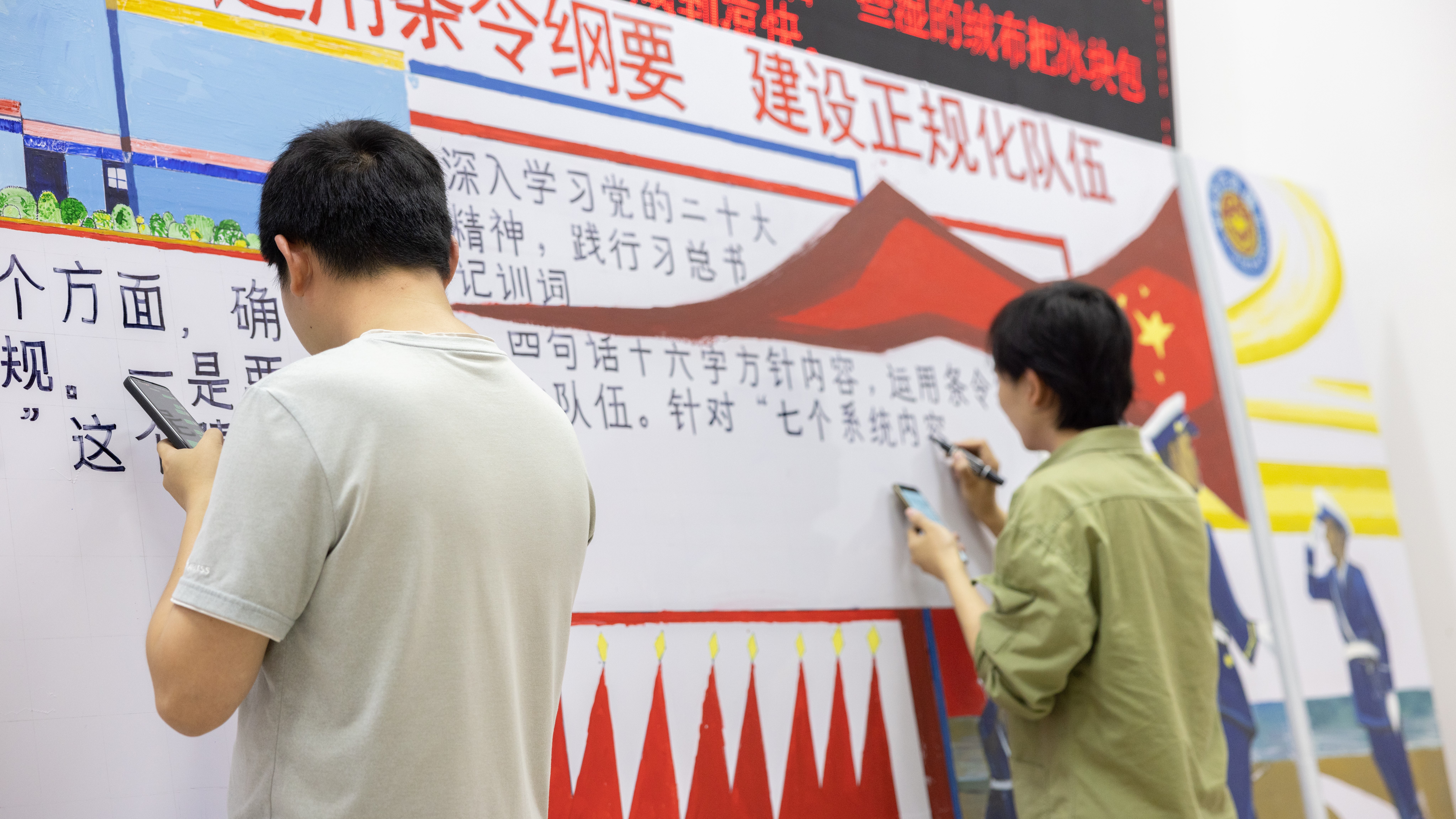 3月18日,美术学院副院长龚为、党总支副书记鲁明阳,带领6名老师和2名学生赴北海市消防救援支队南珠消防救援站开展社会服务活动,为救援站设计并绘制以“运用条令纲要,建设正规化队伍”为题的宣传板报。