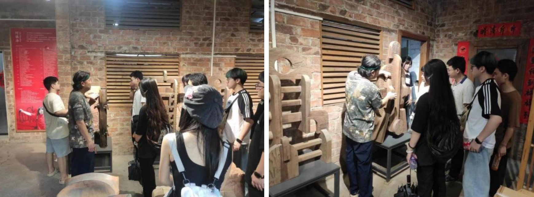 第三站考察广西艺术学院著名雕塑家何镇海教授的雕塑艺术工作室,让学生领略艺术家工作室的艺术氛围与风采,对名家雕塑作品的欣赏,并加深学习与探讨。何教授给同学们分享了自己的“门窗”传统艺术符号再创作的个人艺术创作了历程,为同学们拓宽艺术创作的思路,及寻找个人艺术风格及语言的重要性。本次艺术之旅同时也划上圆满的句号。(欧安佳 摄)