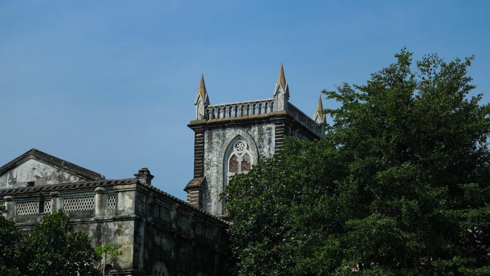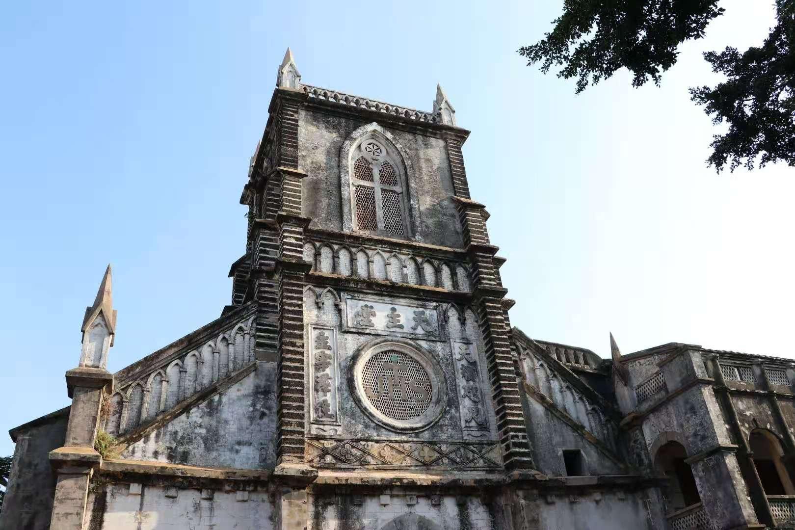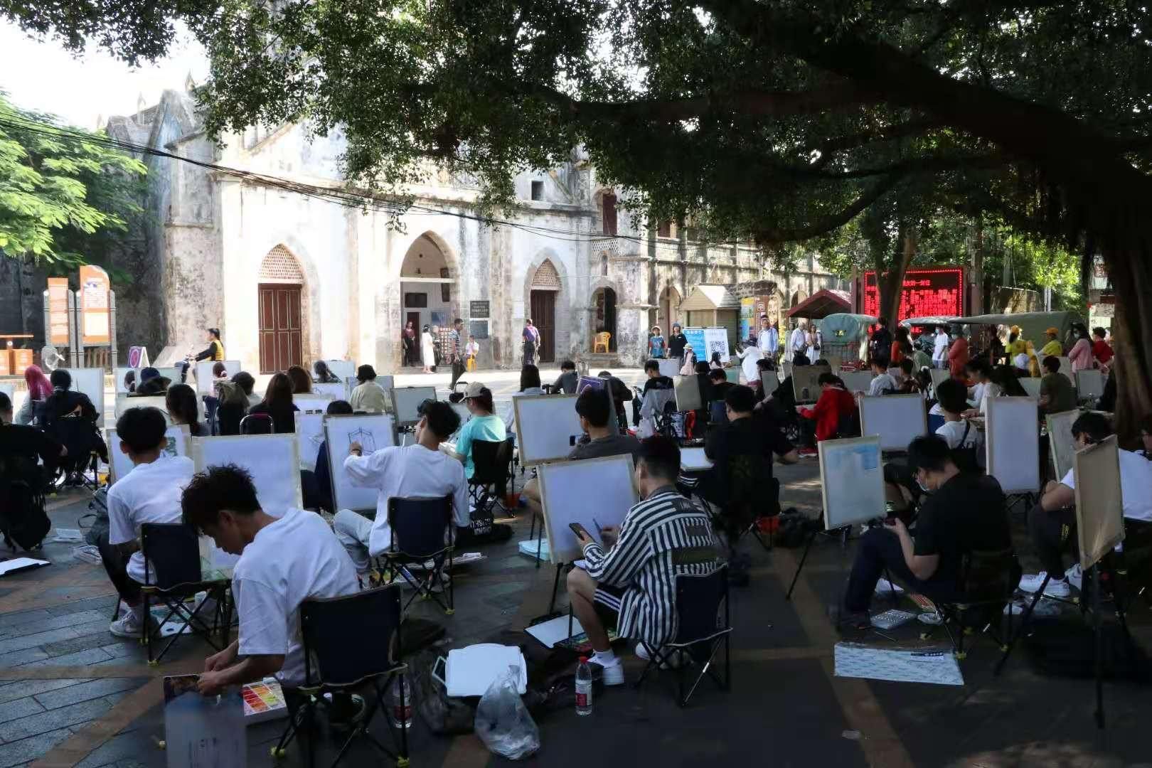 老师带领着学生们展开了五天四夜的写生生活,住在名宿夜晚下课,可以在海边吹着海风,感受着大自然的洗礼。在涠洲岛上低矮的民居中间,有一座有着高耸的罗马式尖塔,法国文艺复兴时期的哥特式建筑,夺人眼目。沧海桑田,星移斗转,教堂墙上的斑驳诉说着历史,诉说着记忆。它历经了风雨的打磨,战争的硝烟,往事已逐渐模糊,唯有建筑孤独地坚守这里,成为时空轮回的说书人,承接着这座岛的过去与未来。