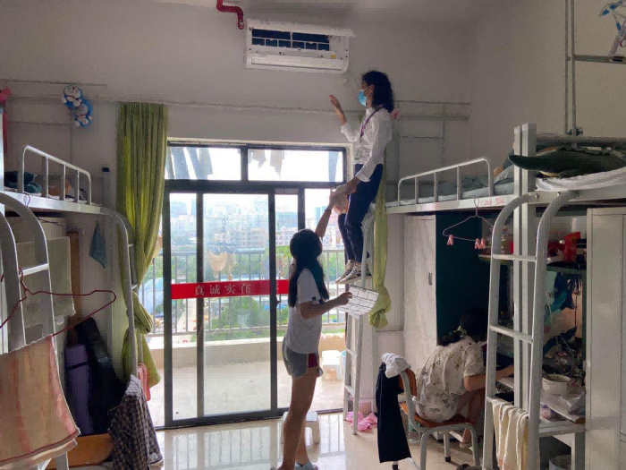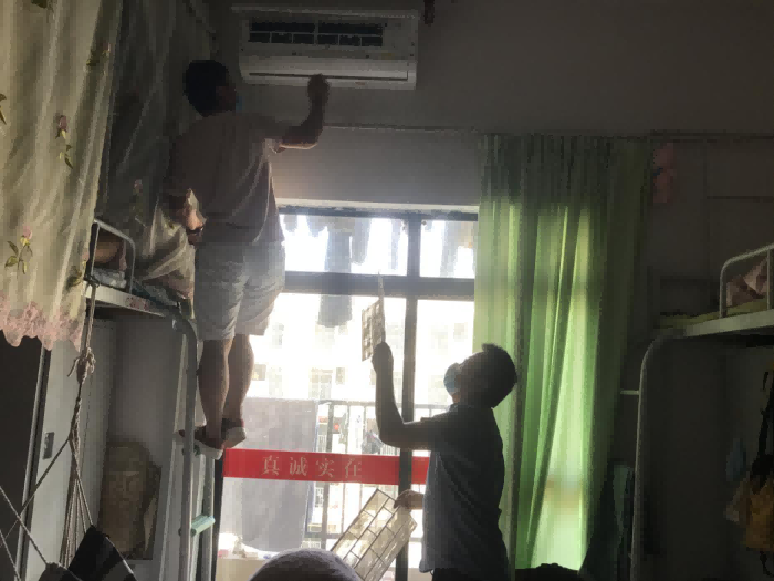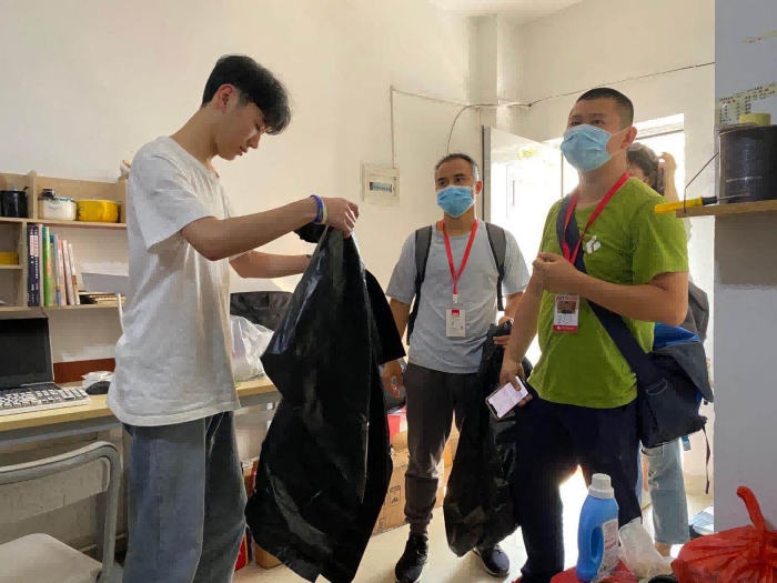 走访过程中,各学院还贴心组织了老师帮学生维修物品、清洗空调滤网,给学生发放垃圾袋等,引导学生共同营造健康、卫生的生活环境。