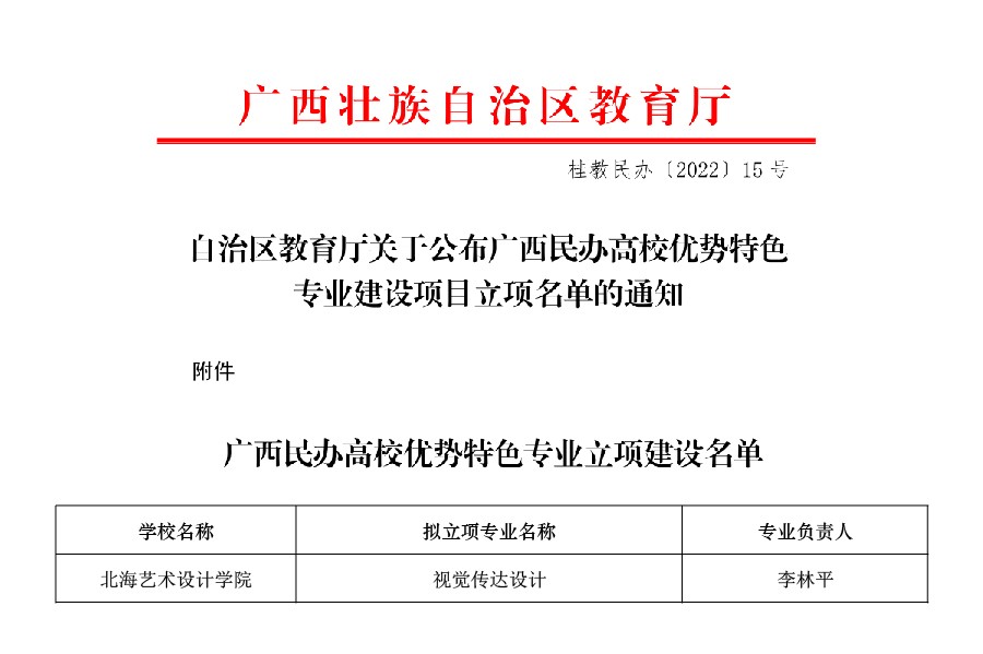 近日,广西壮族自治区教育厅下发《自治区教育厅关于公布广西民办高校优势特色专业建设项目立项名单的通知》(桂教民办〔2022〕15号),公布了2022年度广西民办高校优势特色专业立项建设名单。我院视觉传达设计专业入选。