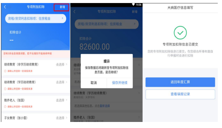 若您需要新增或修改专项附加扣除信息,可点击【新增】, 跳转至采集界面。采集完成后,可选择跳转回年度汇算继续 填报。