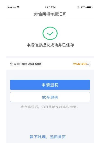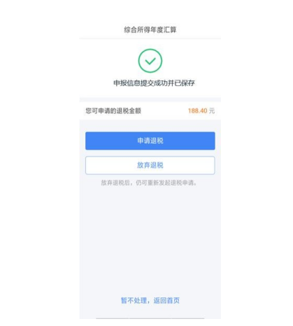 如果您的银行卡不在身边,或者暂时不想退税,可以点 击【暂不处理,返回首页】。后续可再次发起退税申请。