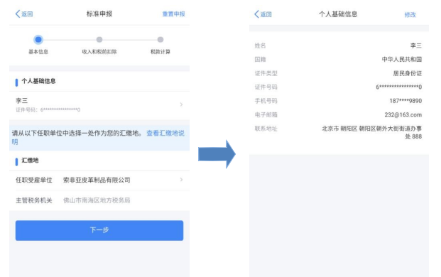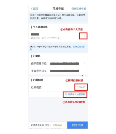 (一)核对个人基础信息、汇缴地、查看收入明细数据, 确认已缴税额。