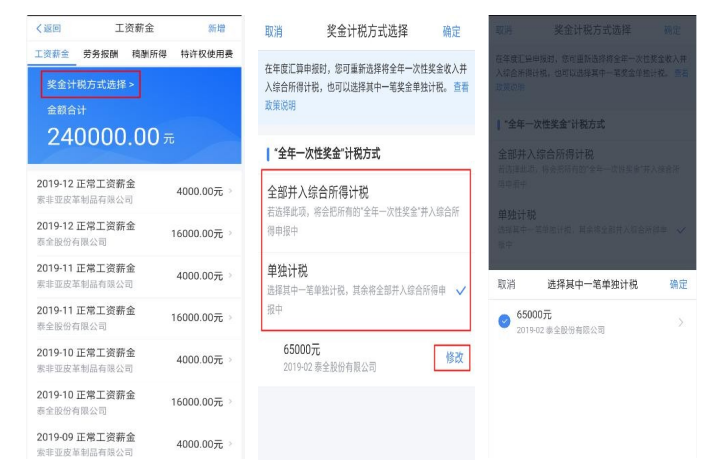年度汇算时,如您选择将全年一次性奖金合并至综合所得计税的,或者有多笔全年一次性奖金的,可通过 【奖金计税方式选择】进行设置。