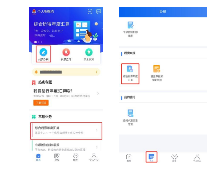 使用手机APP 端申报,您可以从以下入口进入年度汇算: 一是从首页的【常用业务】区块的【综合所得年度汇算】进入;二是从【快捷入口】-【我要办税】下或底部【办税】菜单进入后,点击在【税费申报】下的【综合所得年度汇算】。