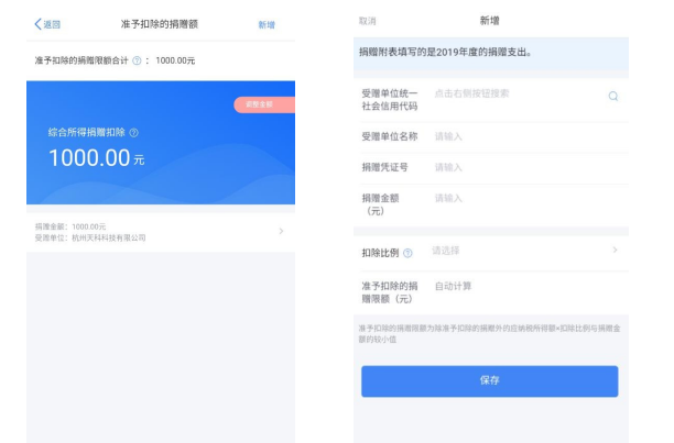 在准予扣除的捐赠额列表界面,您可进行新增和修改。