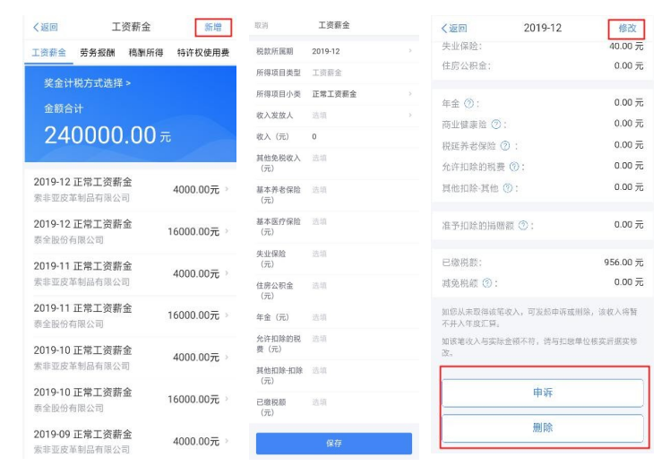 点击除专项附加扣除之外的明细数据可进入对应详情 界面,您可进行【新增】、【修改】、【删除】、【申诉】等操作,步骤同前一步的(一)完善收入数据一致。