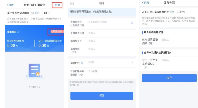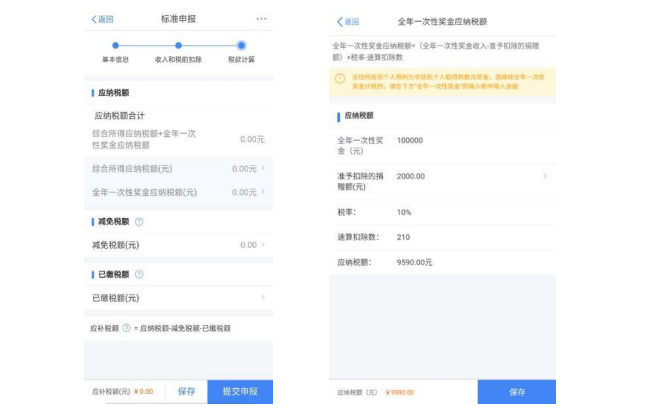 您可在税款计算界面,点击【全年一次性奖金应纳税额】, 进入详情填写相应收入。若您有公益性捐赠支出,您可点击【准予扣除的捐赠额】(或在收入和税前扣除信息界面的【准 予扣除的捐赠额】)进入捐赠详情界面进行【新增】和【设 置扣除】。
