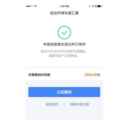 若您收入不足 12 万元且有应补税额,或者收入超出 12 万元但应补税额≤400 元,申报提交后无需缴款。