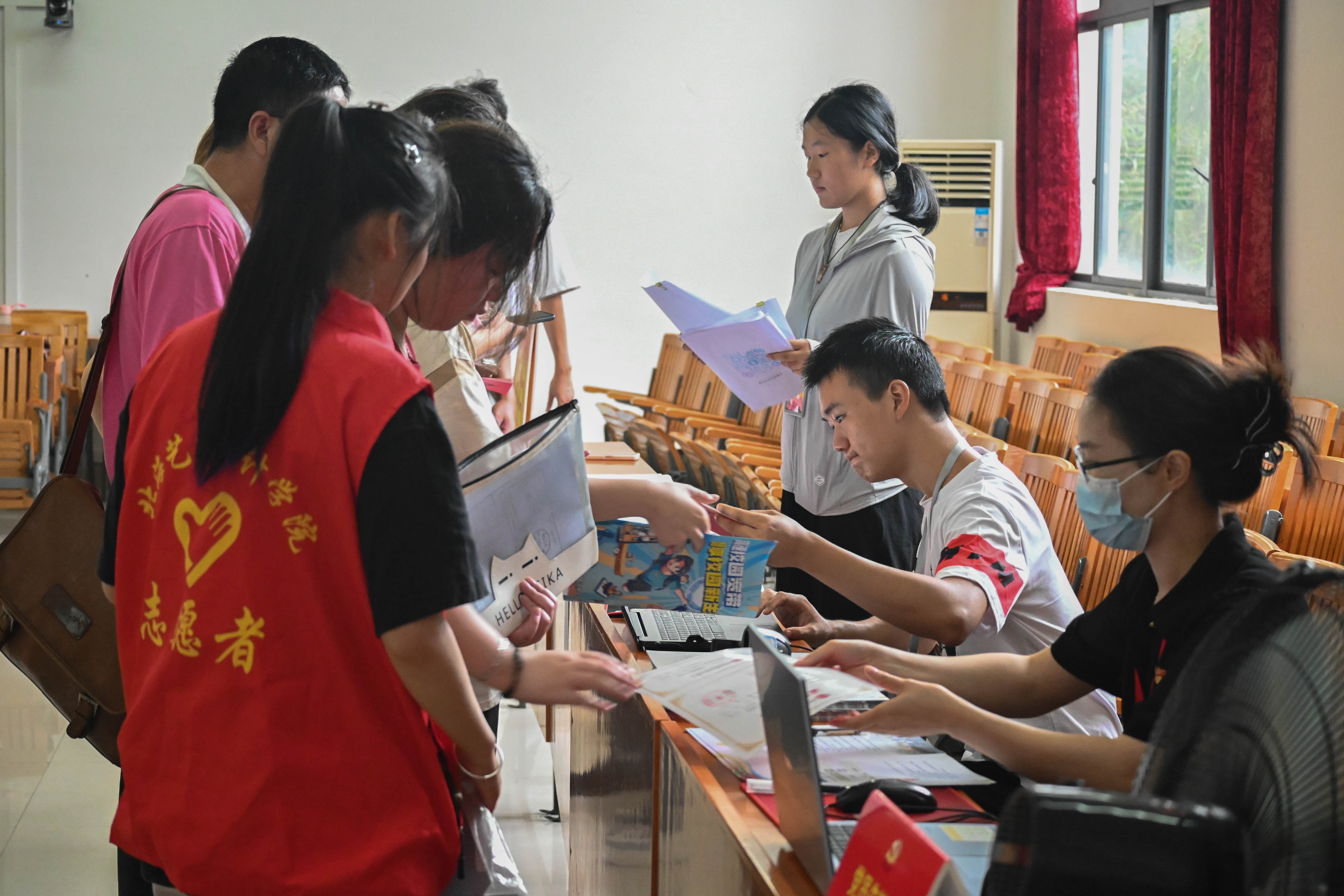 报到当天,教师党员、学生预备党员以及入党发展对象、入党积极分子新生接待志愿者早早到达迎新场地。在火车站迎新接待点,志愿者在出站口高举接站牌翘首以盼,接到新生后便热情地引导他们到乘车点乘车,过程中主动帮新生学搬运行李,提醒大家注意安全。在校内迎新接待点,志愿者引导新生按照报到流程办理入学手续,帮助新生搬运行李,志愿者为新生介绍校园环境。为了方便新生及家长快速辨识,志愿者统一穿着红色志愿服,佩戴工作牌。纵使身心疲惫、大汗淋漓,志愿者仍精神饱满,认真做好迎新工作。