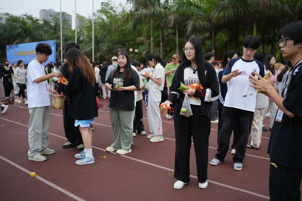 当天,学院师生身着各民族服饰,佩戴精美的配饰,通过民族舞蹈、民族歌曲、民族服装走秀等节目让在场师生“沉浸式”感受到壮乡儿女的独特与风情。此外,还举办了民族文化体验活动,学院师生参加了民族体育竞技、民族美食体验、民族手工艺品展示等活动。现场参与抛绣球、竹竿舞、背篓绣球、溜铁环旱地龙舟、手工绣球制作等民族活动,品尝了具有壮乡特色的民族美食,五色糯米饭、艾叶糍粑、彩蛋等,欣赏到了琳琅满目的民族手工艺品,尽显壮家儿女心灵手巧和热情好客,展现了八桂人民的幸福生活,给现场的师生带来了一场视听盛宴。