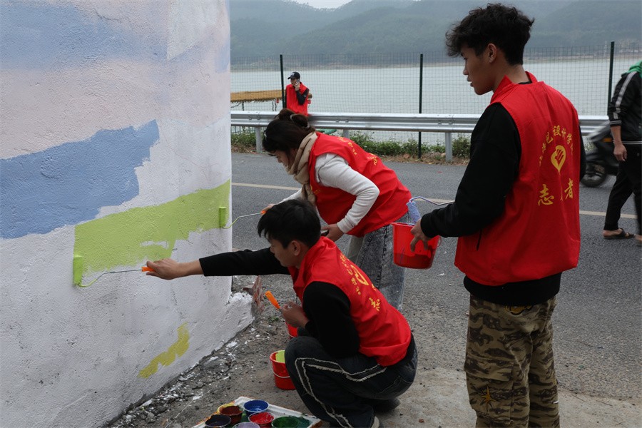 学生进行井山村小洱海墙绘绘制过程