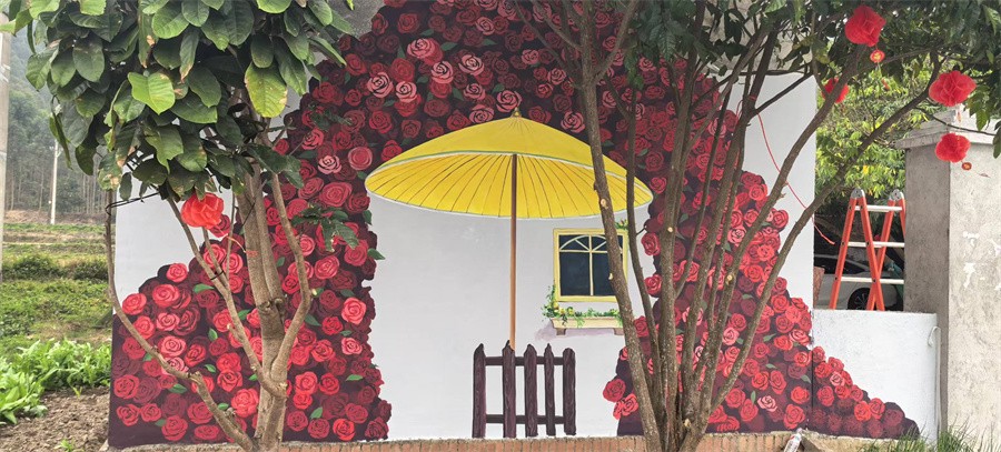 在墙绘作品创作过程中,师生团队深入挖掘井山村历史文化底蕴,将红色革命故事、农耕生活的智慧与勤劳以及生态旅游的绿色发展理念巧妙融入作品,同时与村民紧密合作,共同参与到墙绘项目的每一个细节,激发村民对本土文化的认同感和自豪感。创作后期,还组织了多次文化交流活动,为村庄带来了更多的人气和旅游资源。墙绘与乡村旅游的深度融合,有效地吸引了游客量,带动周边民宿发展、助力农产品销售增收,用艺术元素激活乡村旅游,促进实现“美环境”与“富口袋”的双向提升。