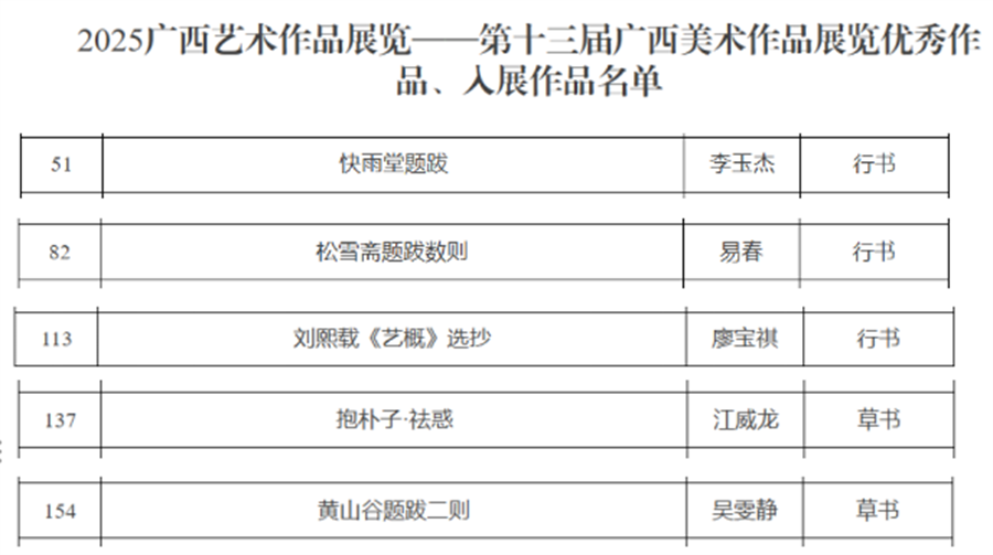 近日,由广西壮族自治区人民政府主办的2025广西艺术作品展览——第十三届广西书法(篆刻)作品展览评选结果揭晓。我校书法学院成绩斐然,4位教师及1位2023级学生的作品成功入展。