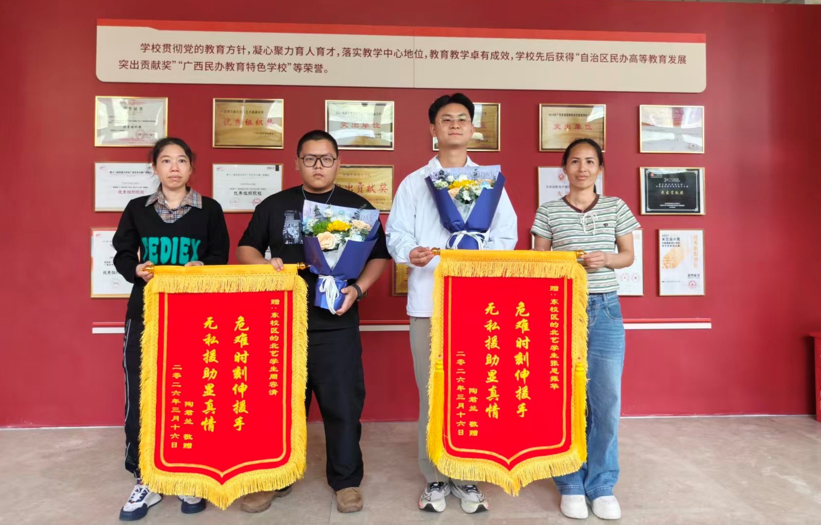 平凡见证伟大,善举点亮青春。张恩振华、周容清用行动践行社会主义核心价值观,展现了新时代大学生的良好精神风貌,为全校师生树立了鲜活的榜样。学校号召全体师生以两位同学为标杆,将善良之心、担当之行融入日常学习与生活,自觉传承和弘扬见义勇为的传统美德,让青春在奉献社会、服务他人中绽放绚丽光彩。