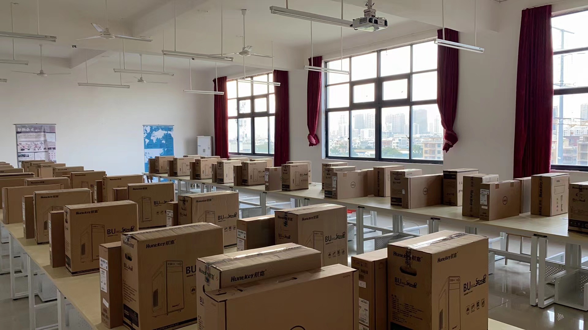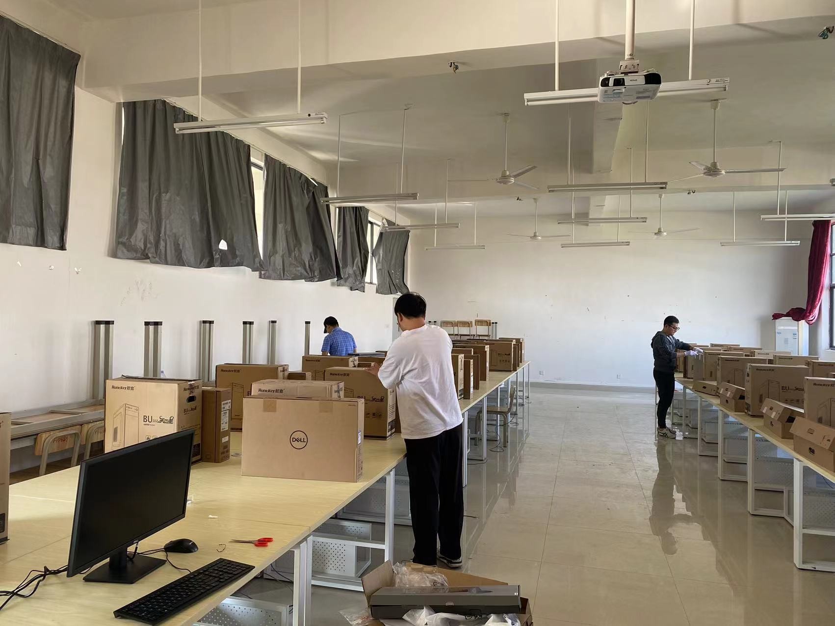 学校西校区公德楼,伦理楼新增20个电子教室,东校区综合楼新增4个电子教室,共960台新电脑,为了电子教室能尽快投入使用,设备与信息处老师加班加点安装新电脑,接入网络,安装系统、机房管理软件,为学校教育教学积极贡献自己的力量。(劳大耀/摄)