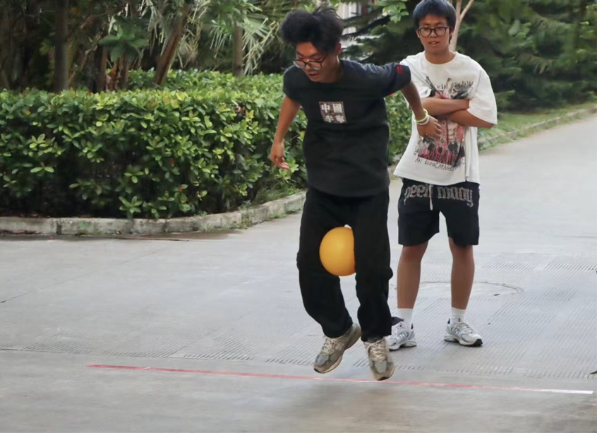 关卡一:夹球跳,队员到达游戏点,与其它队员汇合,参赛队员用两腿夹着气排球中途不能掉落,双手不能触碰到球。同学们一摇一摆,艰难的运作着,最终走向终点。这种迎难而上的魄力展露我们的风采!