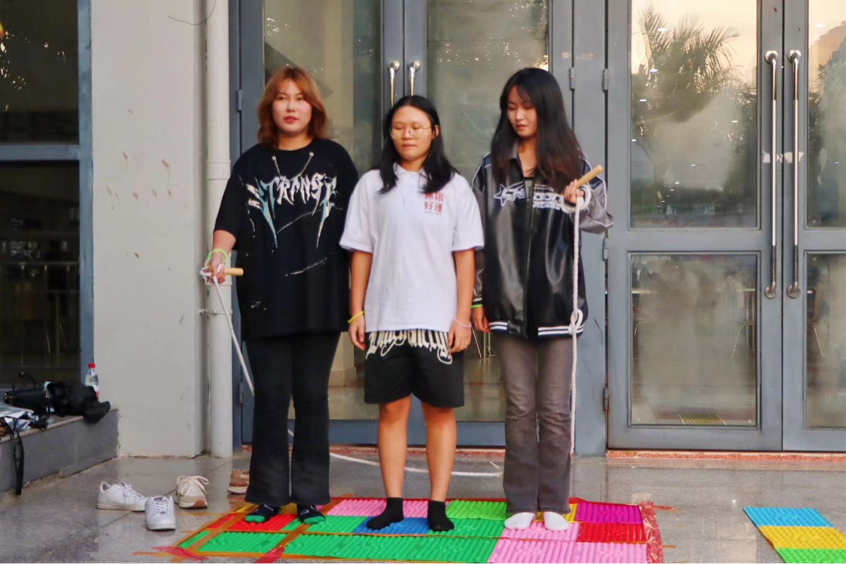 关卡二:指压板跳绳。前俩名队员到达关卡二后.与此关卡等候的同学汇合。三人同站在指压板上,其中两人各用左/右手摇绳,第三人站两人中间,三人一同起跳,完成五个,即为结束。