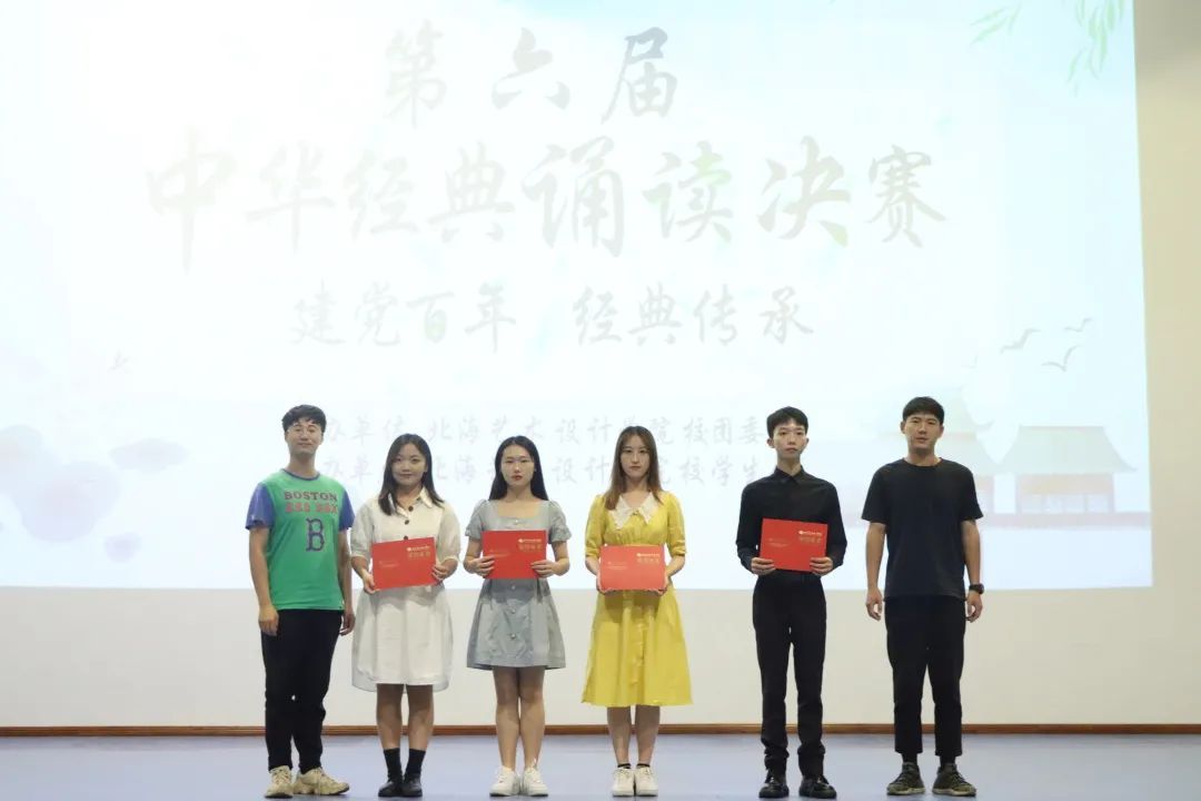 为庆祝中国共产党建立一百周年,进一步强化大学生思想政治教育,弘扬经典,传承红色基因,培养当代大学生的诵读能力,北海艺术设计学院举办第六届中华经典诵读大赛。大赛决赛于2021年6月4日晚上19:30在西校区大礼堂举行。